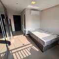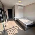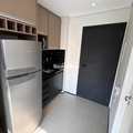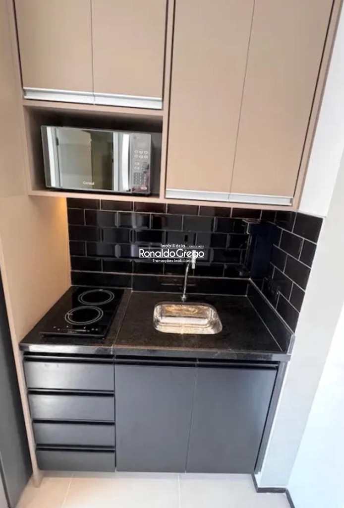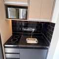 Mobiliado com armários, cama, Geladeira grande, cooktop, micro-ondas e utensílios